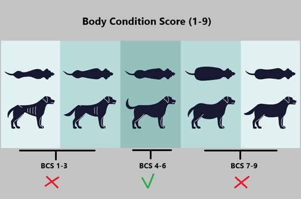 Щоб визначити, чи є собака худим, нормальної ваги або занадто товстим, ветеринари не тільки оцінюють вагу собаки, а й використовують так званий Body Condition Score, або скорочено BCS. Це стандартизована система балів від 1 до 9, яка оцінює певні характеристики статури та присвоює їх стану харчування.