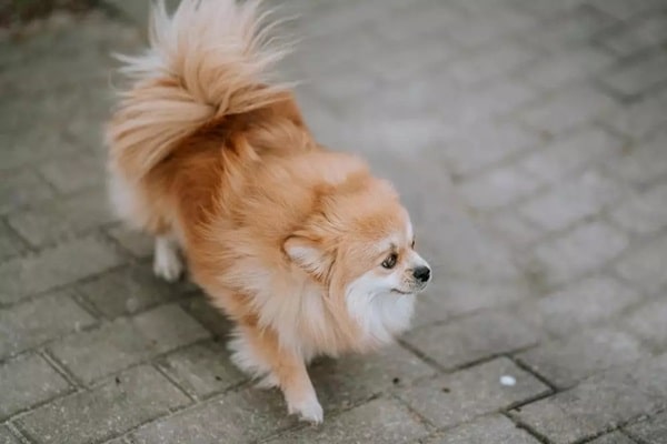 Прогини і опуклості від холки до основи хвоста відсутні. Помірно підібраний живіт переходить у нижню частину ребер. Передпліччя і стегна прикрашають пишні очоси. Щільно притиснутий до спини хвіст загорнутий у тугий бублик.