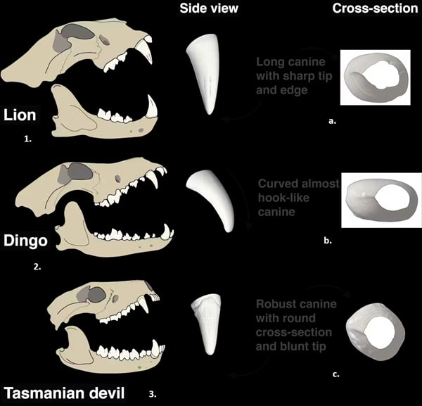 Дослідники просканували і порівняли ікла понад 60 хижаків, включно з тиграми, койотами, білими ведмедями, росомами, єнотами і навіть плямистою сумчастою куницею. Потім ми вивчили зв’язок між формою і функцією іклів.