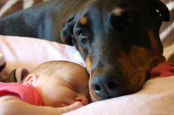 - Підвищена заклопотаність немовлям, якщо те плаче або засмучене. Доберман буде пильно спостерігати за малятком доти, доки ситуація не вирішиться.